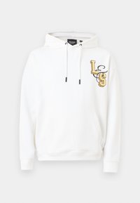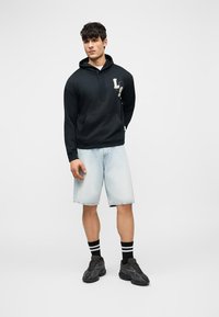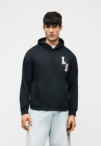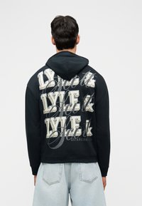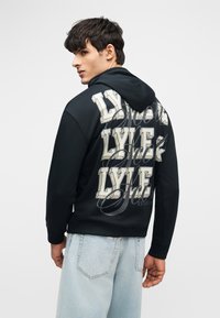 Άνδρας που φοράει μαύρο φούτερ με κουκούλα με μεγάλα λευκά γράμματα "LYLE &" επαναλαμβανόμενα τρεις φορές στην πλάτη, σε συνδυασμό με ανοιχτό μπλε τζιν.