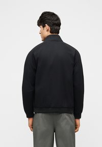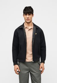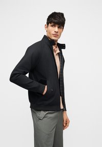 Άνδρας που φοράει μαύρο μπουφάν με καρό φόδρα πάνω από μπεζ πόλο πουκάμισο και γκρι παντελόνι, στέκεται μπροστά σε ένα απλό φωτεινό φόντο.
