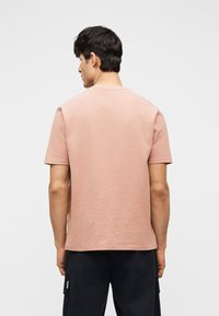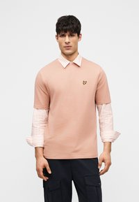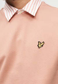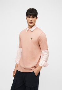 Άνδρας με ριγέ ροζ πουκάμισο με γιακά, φορεμένο κάτω από κοντομάνικο πουλόβερ ροδακινί, και μαύρο παντελόνι καμπαρντίνα με τσέπες cargo.