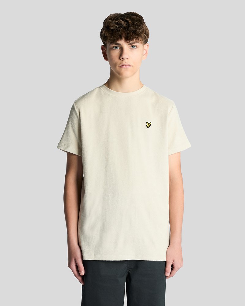 Έφηβος αγόρι με σγουρά μαλλιά, φοράει απλό κρεμ μπλουζάκι με μικρό κίτρινο λογότυπο πουλιού στο στήθος και μαύρο παντελόνι, στέκεται μπροστά σε γκρι φόντο.