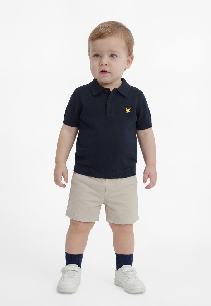 Νήπιο που στέκεται φορώντας μπλε ναυτικό πόλο με κίτρινο έμβλημα, μπεζ σορτς, μπλε ναυτικά καλτσάκια και λευκά αθλητικά παπούτσια σε λευκό φόντο.