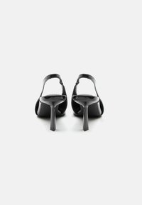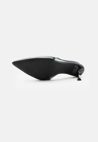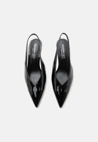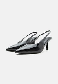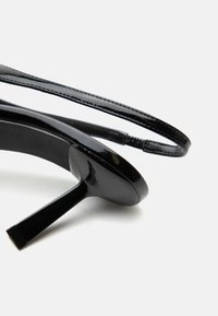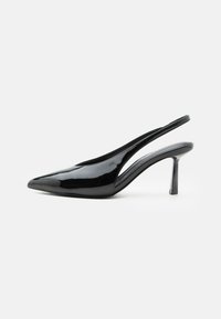 Μαύρο γόνατο από λουστρίνι με λουράκι στο πίσω μέρος, μυτερή μύτη και λεπτό στιλέτο τακούνι σε λευκό φόντο.