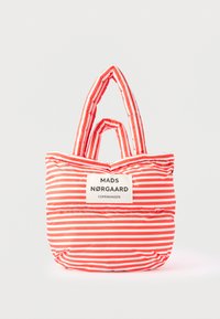 Τσαντάκι ώμου με επένδυση, ριγωτό σε κόκκινο και άσπρο, με δύο λαβές και ετικέτα με το λογότυπο "Mads Nørgaard Copenhagen" στο μπροστινό μέρος.