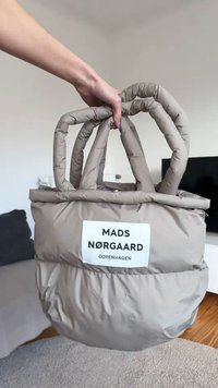 Μπεζ τσάντα ώμου με επένδυση και δύο λαβές, με λευκή ετικέτα στο μπροστινό μέρος που φέρει την επιγραφή "MADS NØRGAARD COPENHAGEN".