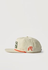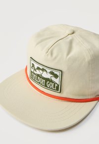 Μπεζ καπέλο μπέιζμπολ με επίπεδη γείσο, πράσινο πατς "Malbon Golf", πορτοκαλί διακοσμητική ρίγα πάνω από τη γείσο και πορτοκαλί κεντημένο λογότυπο στο πλάι.
