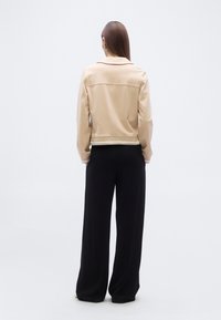Γυναίκα που φοράει μπεζ μπουφάν με κουμπιά και κορδόνια πάνω από λευκό τοπ και μαύρο παντελόνι, στέκεται με τα χέρια στις τσέπες μπροστά σε απλό φόντο.