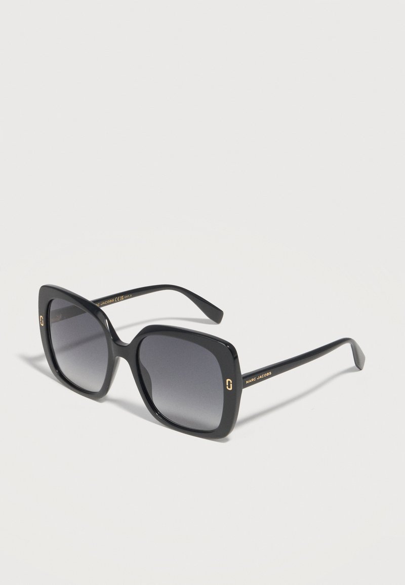 Μαύρα υπερμεγέθη τετράγωνα γυαλιά ηλίου με βαθμιαία σκουρόχρωμους φακούς και χρυσό λογότυπο Marc Jacobs στους βραχίονες και τις μπροστινές γωνίες.