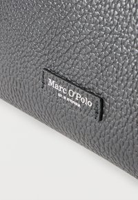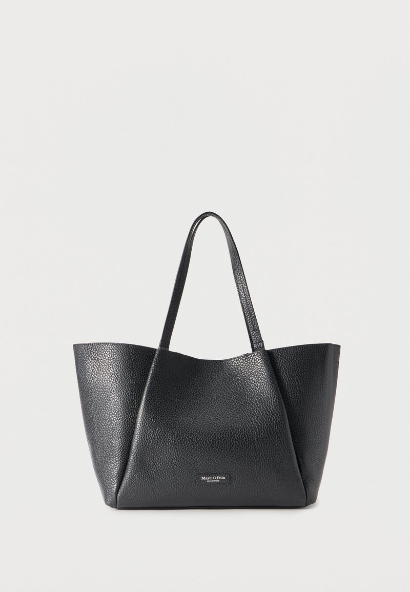Μαύρη τσάντα tote από δερματίνη με δύο χερούλια και μικρό ασημένιο λογότυπο Marc O'Polo στο κέντρο μπροστά.