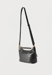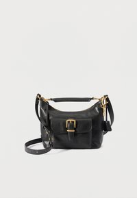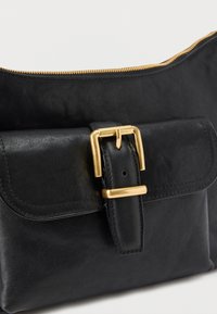Μαύρη δερμάτινη γυναικεία τσάντα με τσέπη με αγκράφα στο μπροστινό μέρος, χρυσά μεταλλικά στοιχεία, ρυθμιζόμενο λουρί ώμου και κεντρικό διαμερισμό με φερμουάρ, σε λευκό φόντο.