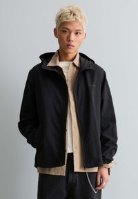 Νεαρός άνδρας με ξανθά μαλλιά που φοράει μαύρο σακάκι πάνω από μπεζ πουκάμισο με κουμπιά και μαύρο παντελόνι, στέκεται μπροστά σε γκρι φόντο.