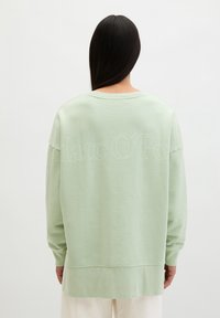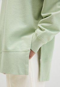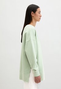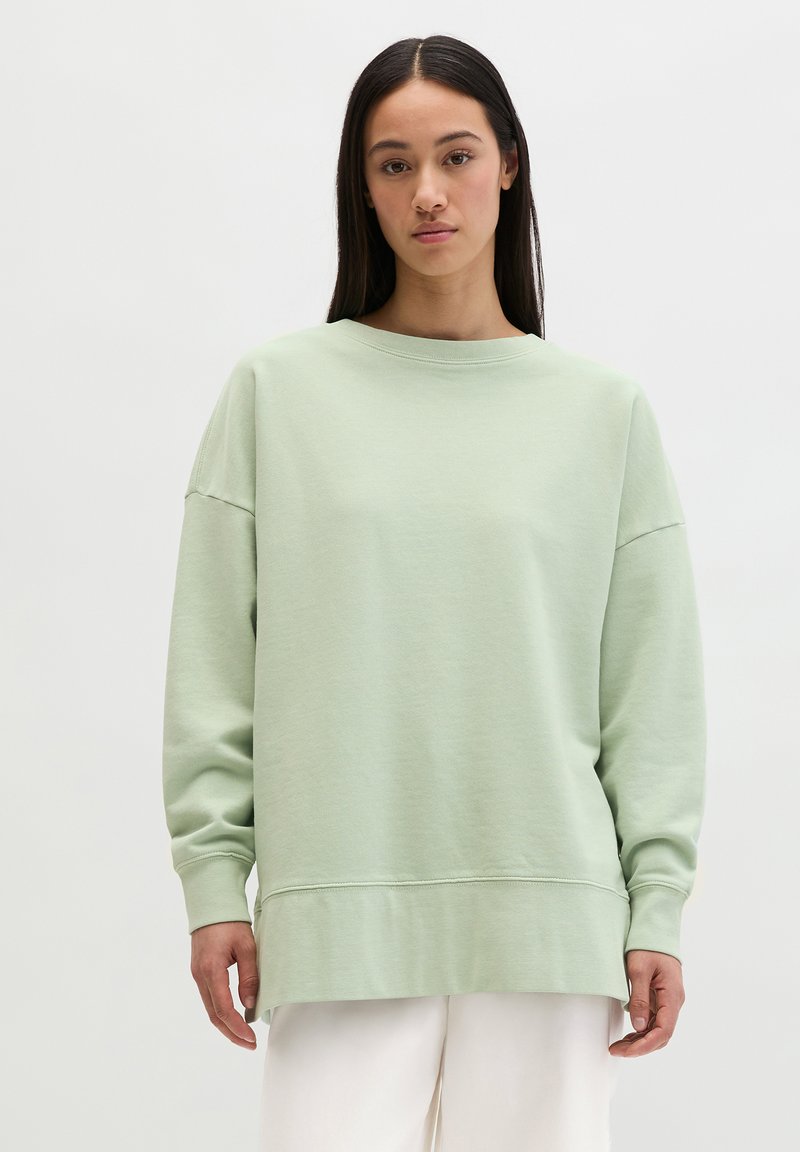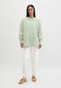 Νεαρή γυναίκα με μακριά σκούρα μαλλιά φοράει φαρδιά ανοιχτό πράσινη μπλούζα και λευκό παντελόνι, στέκεται μπροστά σε λευκό ομοιόμορφο φόντο.