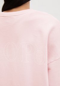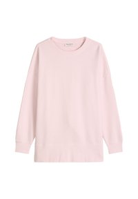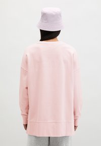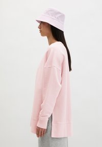 Γυναίκα που φοράει ένα ανοιχτό ροζ φαρδύ φούτερ, καπέλο τύπου bucket στο ίδιο χρώμα και γκρίζο παντελόνι, στέκεται με τα χέρια στις τσέπες μπροστά σε απλό φόντο.