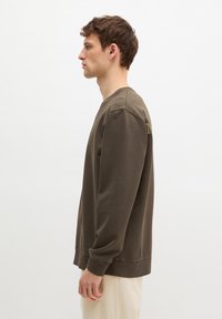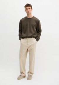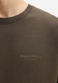 Άνδρας που φορά καφέ φούτερ με το κείμενο "Marc O’Polo EST. IN STOCKHOLM" στην πλάτη, συνδυασμένο με ανοιχτό μπεζ παντελόνι, γυρισμένος από την πίσω πλευρά.