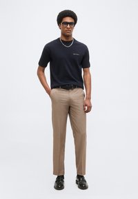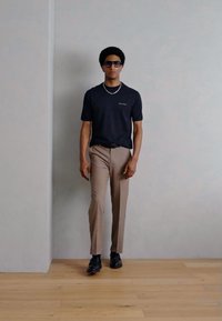 Άνδρας που φοράει σκούρο μπλε μπλουζάκι Marc O'Polo, μπεζ παντελόνι, μαύρη ζώνη, ασημένιο μενταγιόν και μεγάλα σκουρόχρωμα γυαλιά ηλίου, στέκεται μπροστά σε ένα μονόχρωμο φόντο.