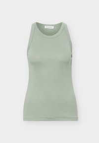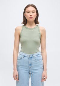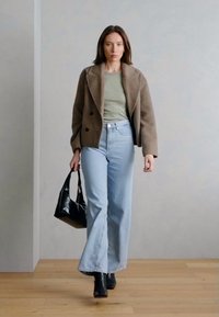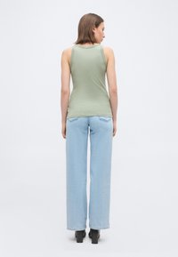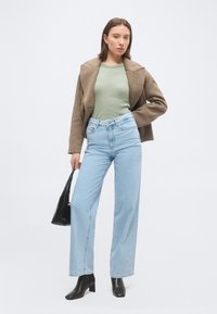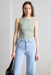 Νέα γυναίκα που φοράει αμάνικο τοπ σε απαλό πράσινο χρώμα και ανοιχτόχρωμα τζιν, κρατώντας μια μαύρη δερμάτινη τσάντα μπροστά σε απλό φωτεινό φόντο.