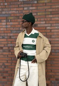 Νέος άνδρας με πράσινο και άσπρο ριγέ πόλο μπλουζάκι και αντίστοιχο καπέλο, με τα χέρια στις τσέπες, στέκεται μπροστά σε λευκό φόντο.