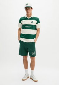 Άνδρας που φοράει λευκό T-shirt με πράσινο αριθμό "67", κείμενο "Scandinavian Football Community" και "Marc O'Polo" στην πλάτη, συνδυασμένο με πράσινα σορτς.