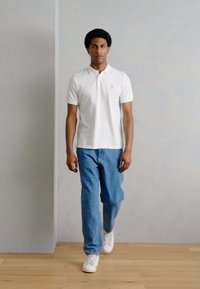 Άνδρας στέκεται σε απλή τοίχο φορώντας λευκό κοντομάνικο πουκάμισο πόλο και μπλε τζιν, με τα χέρια στις τσέπες, με ορατό τατουάζ στο αριστερό αντιβράχιο.