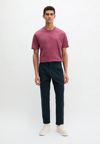 Νέος άνδρας που στέκεται, φορώντας απλό κοντομάνικο μπλουζάκι σε χρώμα μαβί με μικρό λογότυπο και σκούρο μπλε παντελόνι, μπροστά σε απλό ανοιχτό φόντο.