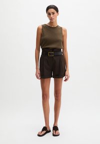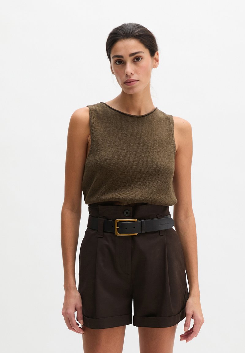 Γυναίκα που φοράει καφέ πλεκτό τοπ χωρίς μανίκια, φορεμένο μέσα σε σκούρα καφέ σορτς με ψηλή μέση και μαύρη ζώνη με χρυσή αγκράφα.