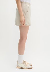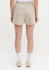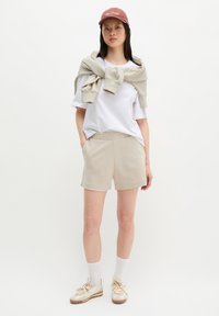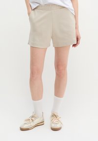 Άτομο που φοράει μπεζ σορτς με ελαστική μέση, λευκές κάλτσες crew και μπεζ αθλητικά παπούτσια σε απλό λευκό φόντο.