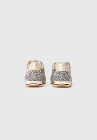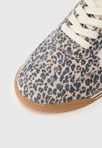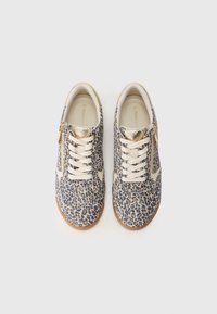 Αθλητικά παπούτσια με λεοπάρ σχέδιο σε μπεζ και χρυσό, διαθέτοντας φερμουάρ στο πλάι, υφή υφάσματος και καουτσούκ σόλα.