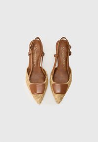 Πέδιλο με τακούνι και λουράκι στον πίσω μέρος, με υφασμένο καλάθι στην μπλε, καφέ δερμάτινες λωρίδες, μυτερή μύτη και ορθογώνια ταμπέλα σε μπεζ χρώμα στη σανίδα.