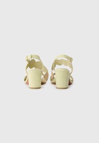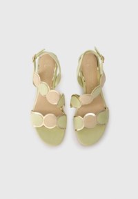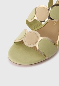 Φωτεινά πράσινα σουέτ γυναικεία σανδάλια με τετράγωνη γάμπα, λουρί στον αστράγαλο με αγκράφα και διακοσμητικά κυκλικά στοιχεία με χρυσή άκρη.