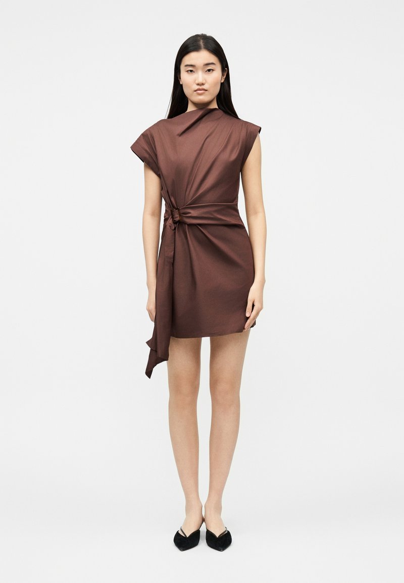 Γυναίκα που στέκεται, φορώντας ένα καφέ μίνι φόρεμα χωρίς μανίκια με ασύμμετρο draped σχέδιο και μαύρα παπούτσια μπαλαρίνες με μυτερή μύτη, μπροστά σε απλό φόντο.