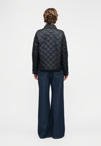 Γυναίκα με κοντά μαλλιά που φοράει μαύρο μπουφάν με καπιτονέ και κουμπιά τύπου σναπ πάνω από μαύρο τοπ και μπλε τζιν, που στέκεται μπροστά σε απλό φόντο.
