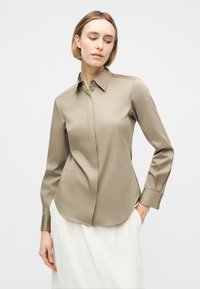 Γυναίκα που φοράει μπεζ πουκάμισο με μακριά μανίκια, λευκό παντελόνι ψηλόμεσο με φαρδιά μπατζάκια και πιέτες μπροστά, και μαύρα μπαλαρίνες με μυτερή μύτη.