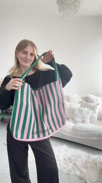 Τσάντα tote με κάθετες πράσινες και ροζ ρίγες, φαρδιές ιμάντες ώμου και λογότυπο «marimekko» σε μαύρο κοντά στη βάση.