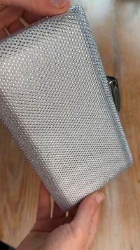 Ορθογώνιο ασημένιο τσαντάκι από υφασμάτινη μεταλλική υφή, με κλείσιμο τύπου κλειδώματος και αποσπώμενη αλυσίδα για μεταφορά.