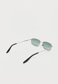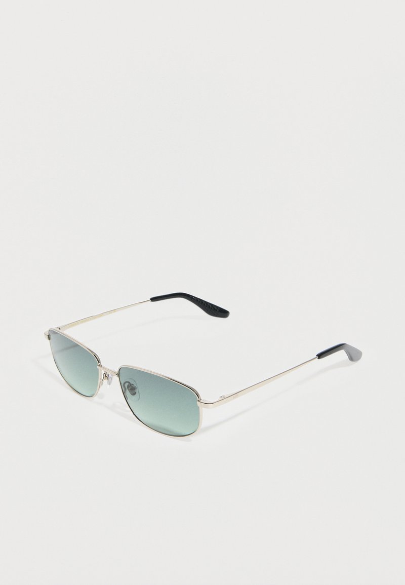 Ορθογώνια γυαλιά ηλίου με ασημένιο πλαίσιο, φακούς με πράσινο τόνο και μαύρες άκρες στα σκέλη, απεικονίζονται πάνω σε απλό λευκό φόντο.