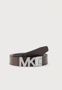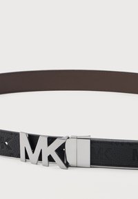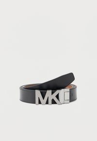 Μαύρη δερμάτινη ζώνη με υφασμένο μοτίβο "MK" και γυαλιστερό ασημένιο πόμολο με τα αρχικά "MK", τυλιγμένη πάνω σε λευκό φόντο.