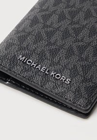 Μαύρο πορτοφόλι Michael Kors με υφή και ανάγλυφο μοτίβο λογότυπου, με ασημί γράμματα "MICHAEL KORS" σε απλό ανοιχτό φόντο.