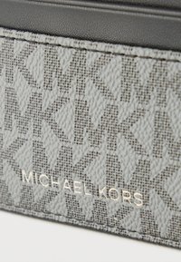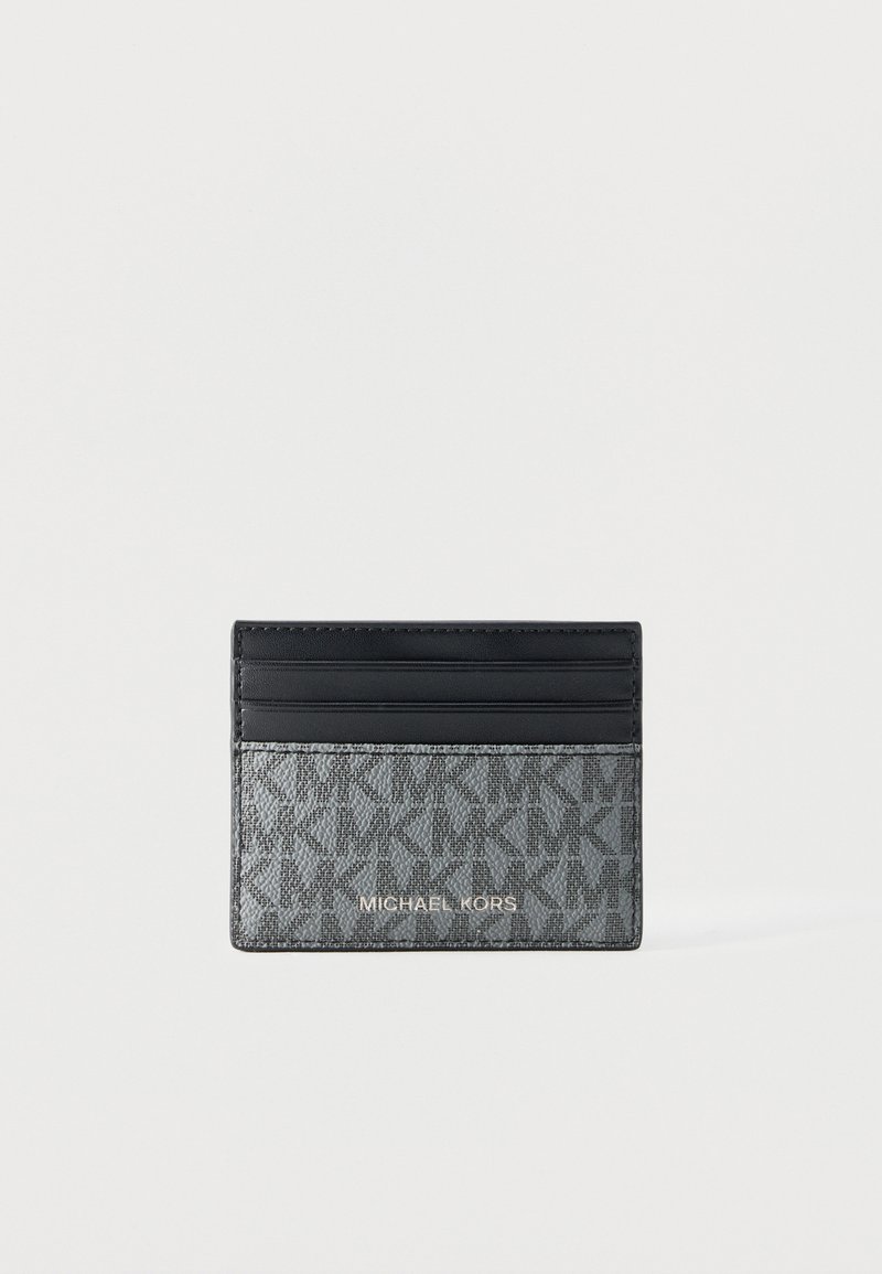 Μικρό ορθογώνιο θήκη καρτών Michael Kors με μαύρο επάνω τμήμα και γκρι μοτίβο στο κάτω μέρος με το όνομα της μάρκας σε χρυσά γράμματα.