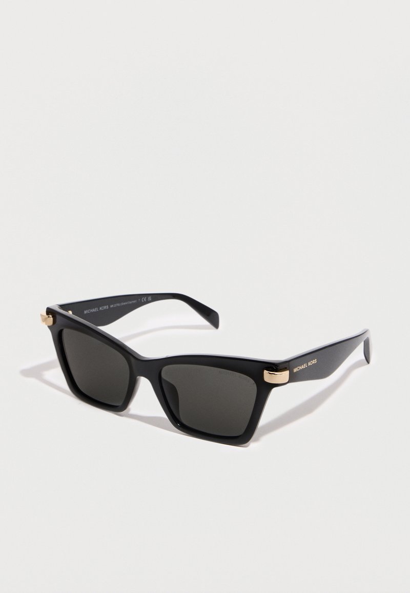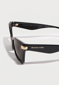 Μαύρα ορθογώνια γυαλιά ηλίου Michael Kors με σκουρόχρωμους φακούς και χρυσές λεπτομέρειες στις αρθρώσεις, εμφανιζόμενα σε λευκό φόντο.