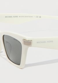 Λευκά γυαλιά ηλίου με ορθογώνιο πλαίσιο, σκουρόχρωμους γκρι φακούς, διακριτική ασημένια λεπτομέρεια μεντεσέ και λογότυπο Michael Kors στο πλαϊνό μέρος.