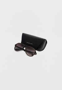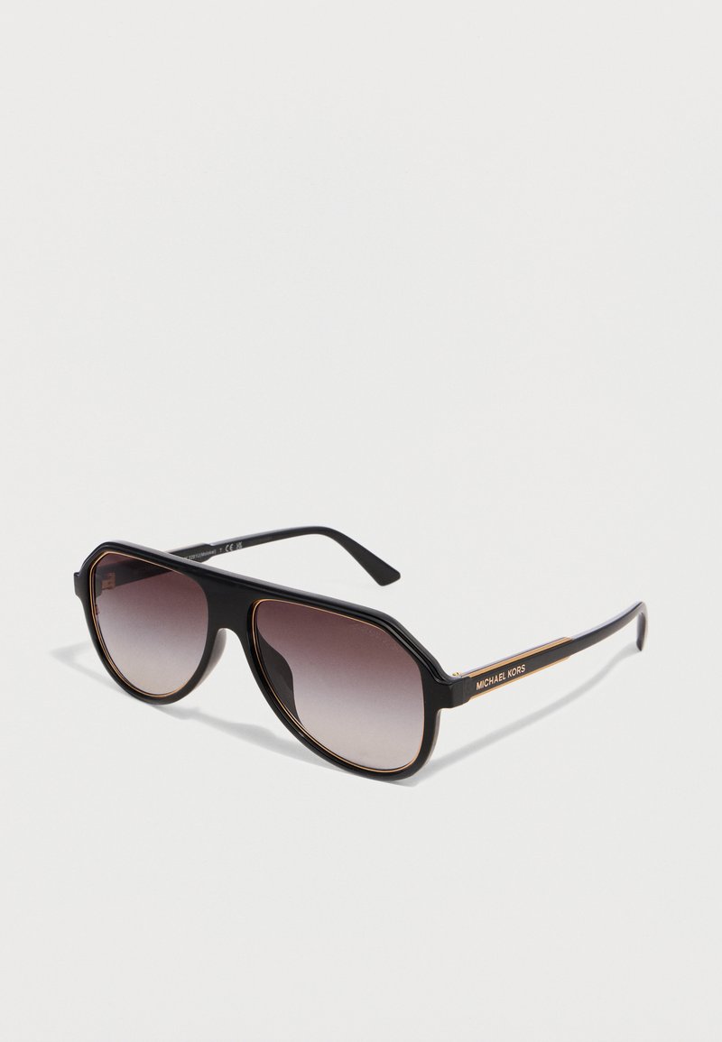 Μαύρα γυαλιά ηλίου aviator Michael Kors με βαθμιαία σκουρα σκούρα φακούς και λεπτή χρυσή επένδυση γύρω από τον σκελετό και τους βραχίονες σε λευκό φόντο.