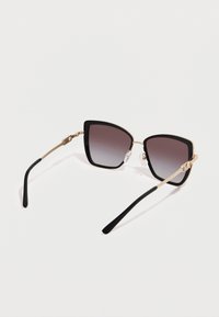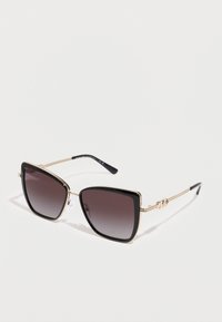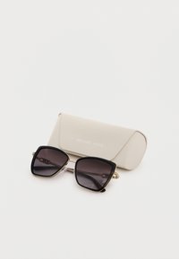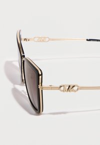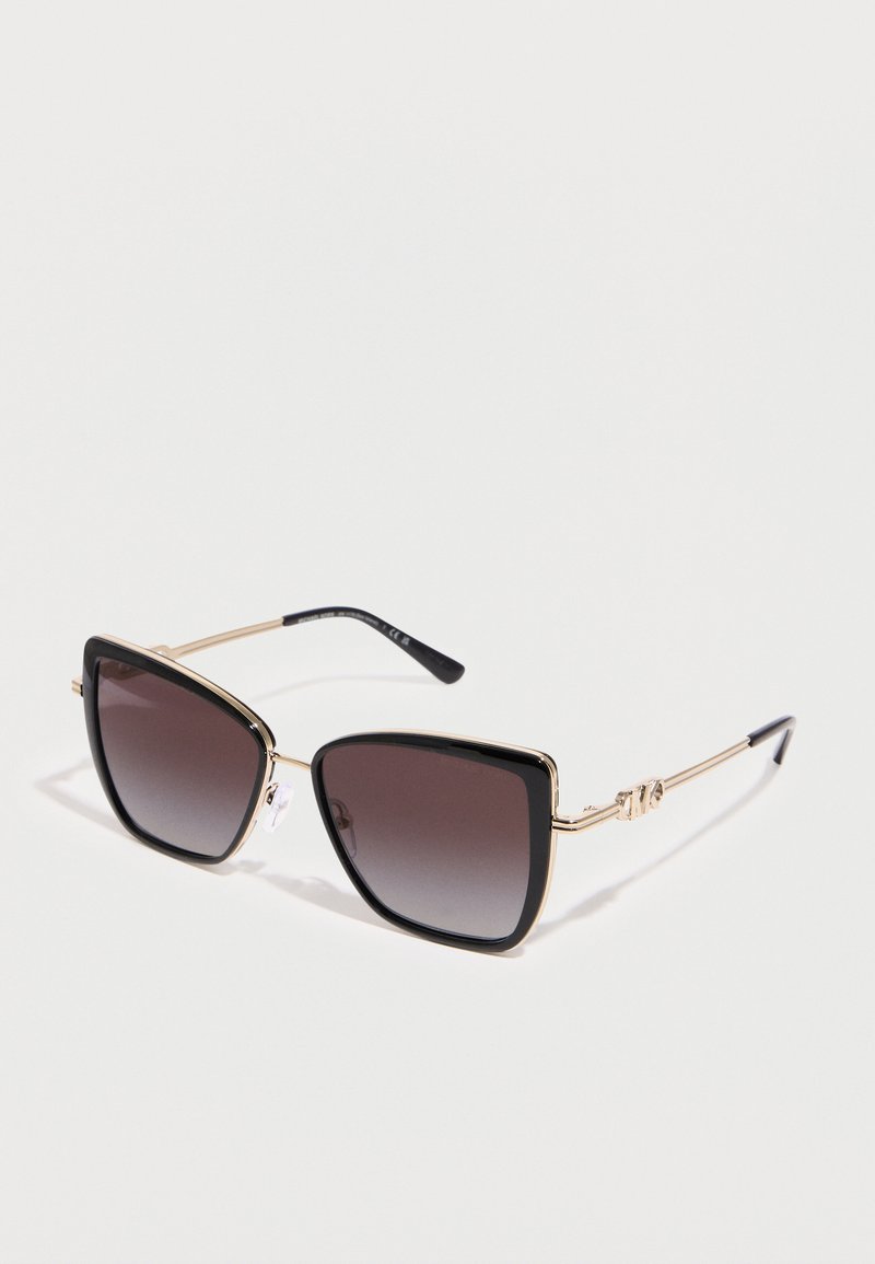 Γυαλιά ηλίου τετράγωνου σχήματος με μαύρους φακούς βαθμιαίας σκιάς και λεπτά χρυσά μεταλλικά πλαίσια, τοποθετημένα σε φωτεινή επιφάνεια.