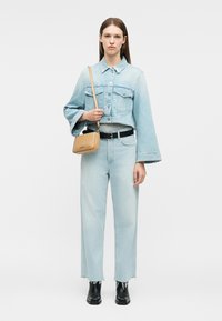 Γυναίκα που φοράει ανοιχτό μπλε τζιν μπουφάν και τζιν παντελόνι, κρατώντας μία μπεζ τσάντα ώμου, με μαύρη ζώνη και μαύρες μποτάκια αστραγάλου, στέκεται σε λευκό φόντο.