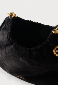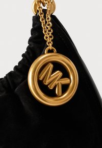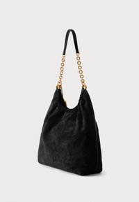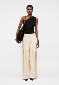 Γυναίκα που φοράει μαύρο τοπ με έναν ώμο, φαρδιά κρεμ πλισέ παντελόνια, μαύρα μυτερά παπούτσια και κρατάει μια μεγάλη μαύρη τσάντα χειρός με λουράκι αλυσίδα.