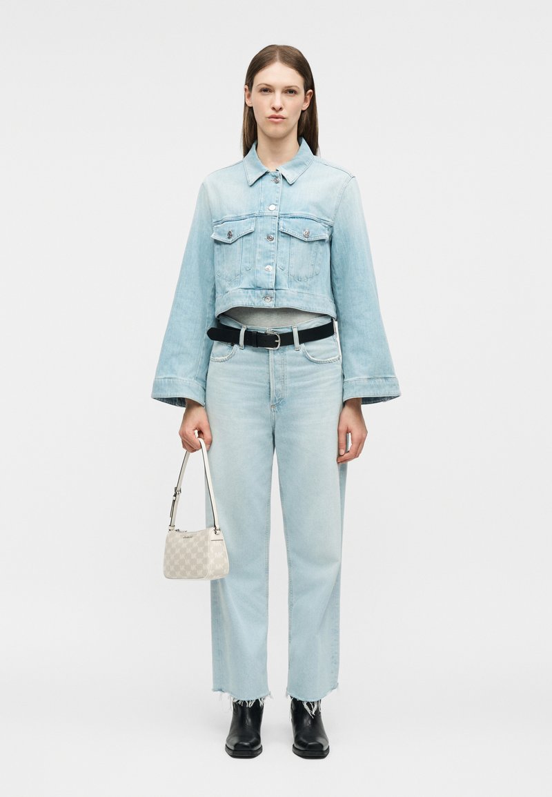 Γυναίκα με ελαφρύ γαλάζιο κοντό τζιν μπουφάν και τζιν παντελόνι που ταιριάζει, μαύρη ζώνη, μαύρα μποτάκια αστραγάλου, κρατώντας μικρή μπεζ τσάντα στο πλάι.
