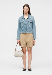 Γυναίκα που φοράει γαλάζιο τζιν μπουφάν και μπεζ σορτς, κρατώντας μια λευκή και καφέ τσάντα, στέκεται μπροστά σε ένα απλό φόντο.