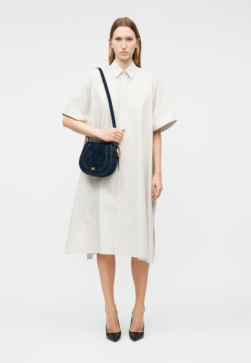 Γυναίκα που φοράει ένα άνετο λευκό φόρεμα με κουμπιά, μαύρα ψηλά τακούνια και μια μπλε σκούρα τσάντα χιαστί με χρυσές λεπτομέρειες, στέκεται μπροστά σε ένα μονόχρωμο φόντο.