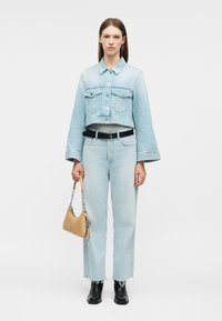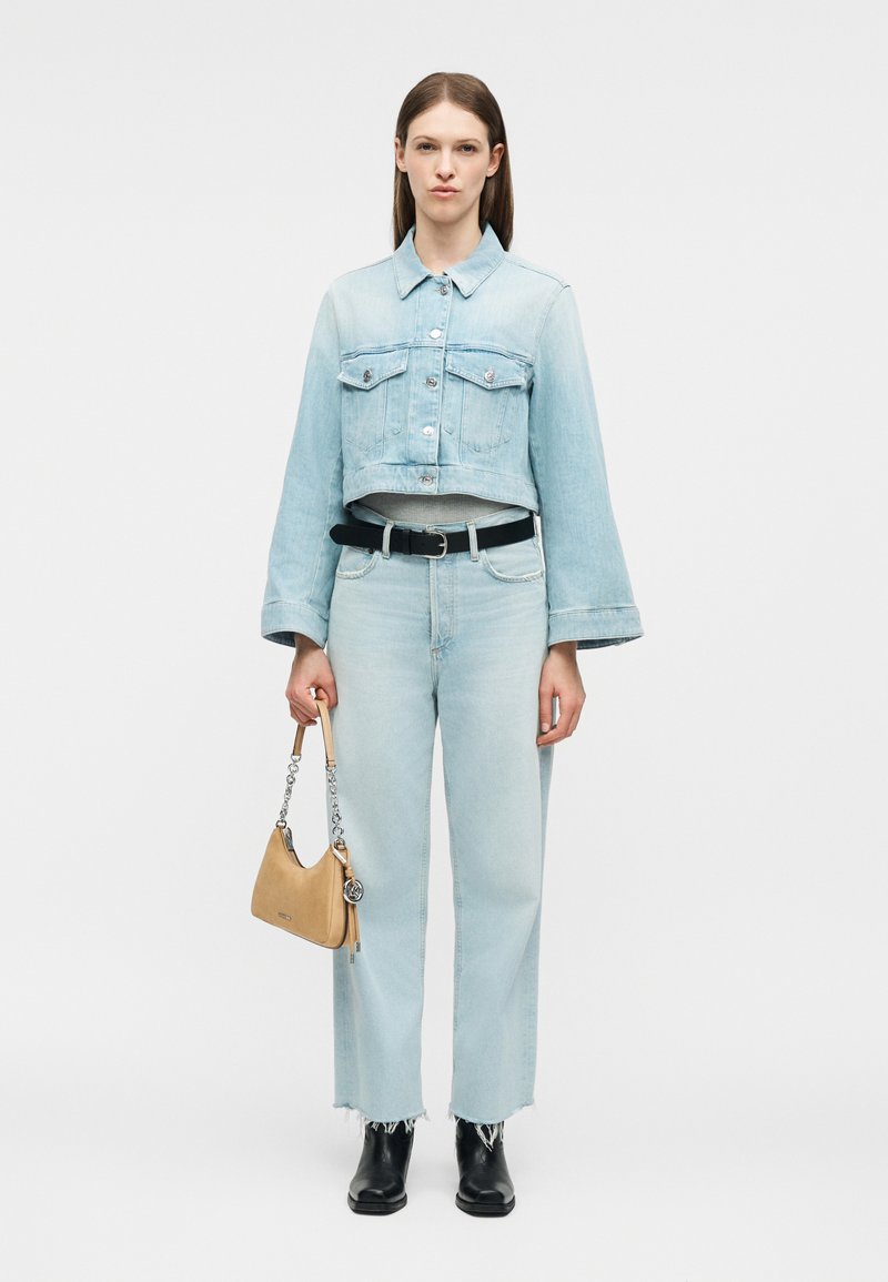 Γυναίκα με ανοιχτό μπλε cropped denim μπουφάν και τζιν, μαύρη ζώνη, μαύρες μπότες, κρατώντας μικρή μπεζ τσάντα με λουράκι αλυσίδα.