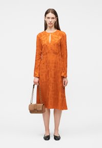 Γυναίκα που φορά ένα πορτοκαλί midi φόρεμα με μακριά μανίκια και διακριτικά σχέδια, κρατώντας μια μπεζ τσάντα με χρυσή αλυσίδα και μαύρες μπαλαρίνες.