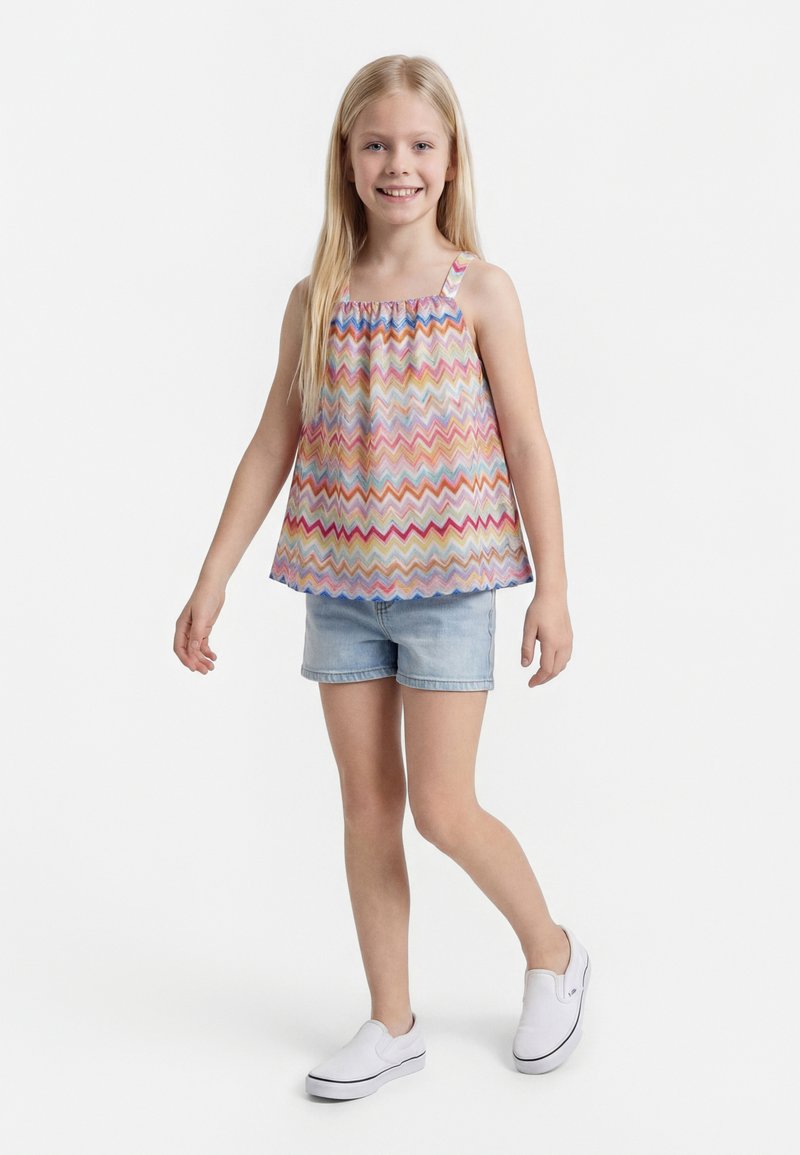 Παιδί με μακριά ξανθά μαλλιά φοράει αμάνικο πολύχρωμο τοπ με ζιγκ ζαγκ σχέδιο και σταυρωτούς ιμάντες, τζιν σορτς και λευκά αθλητικά παπούτσια, στέκεται με την πλάτη προς τα εμπρός.
