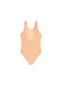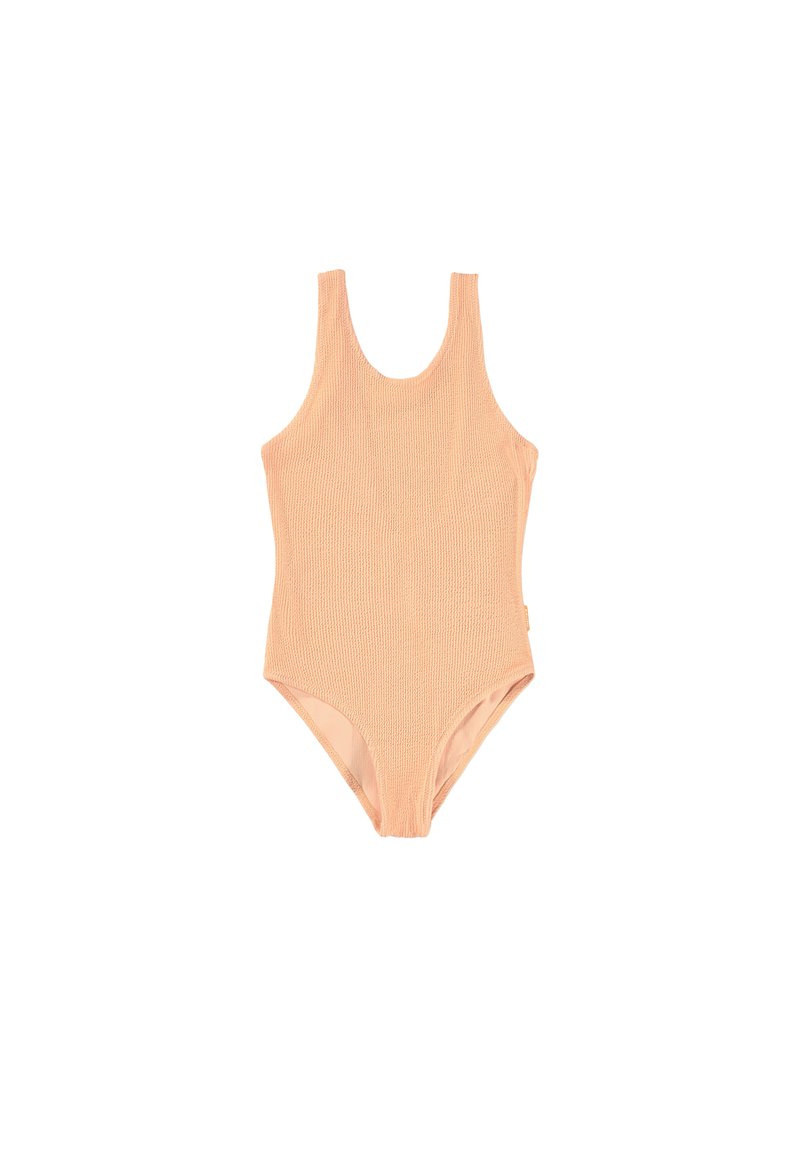 Μαγιό ολόσωμο χρώματος ροδακινί με υφή πλεκτού σχεδίου, φαρδιές σχοινί μπράτσες και στυλ υψηλής κοπής ποδιού. Χωρίς ορατά εξαρτήματα ή αξεσουάρ.